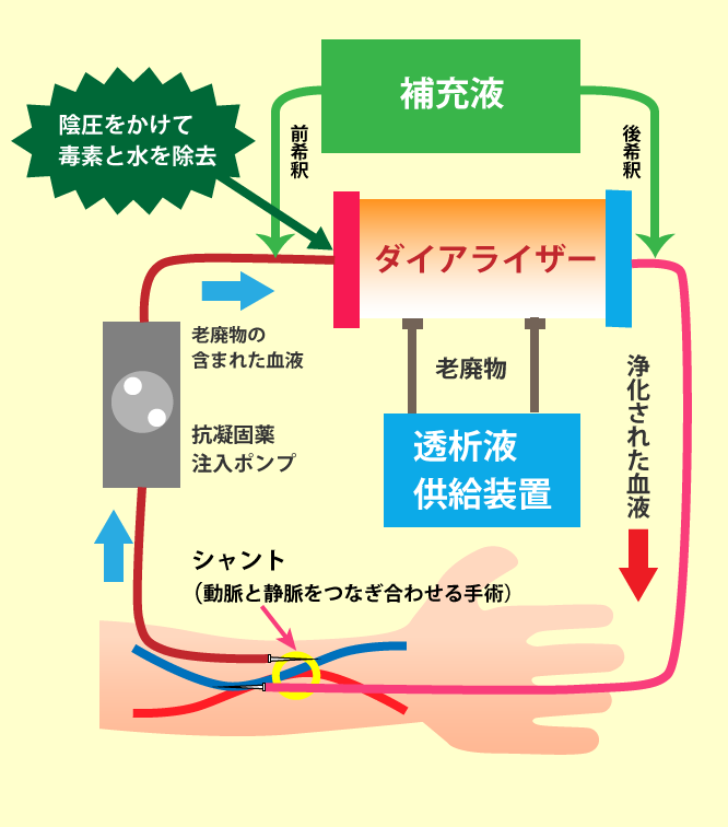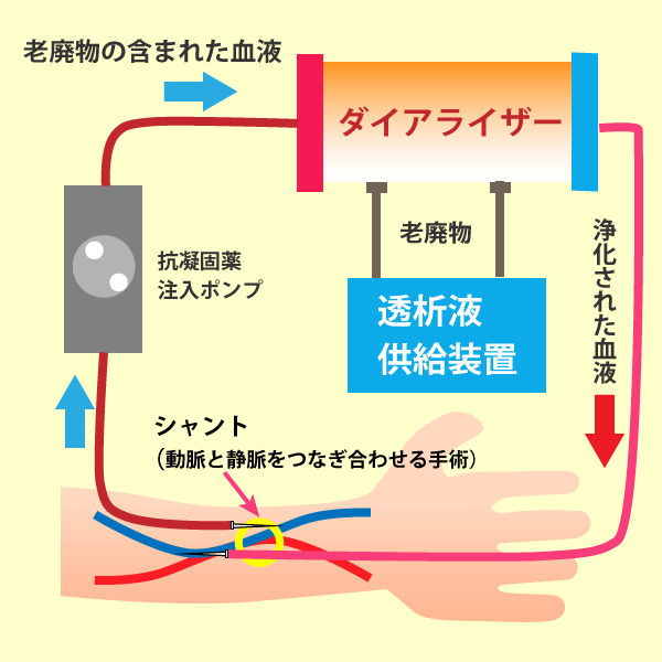 - 血液透析(HD)は、血管に針を刺して血液を連続的に透析装置とダイアライザーへ取り出す必要があるため、 簡単な手術により、一般に利き腕ではない方の前腕の動脈と静脈を皮下でつなぎ合わせて、シャントと呼ばれる血液の取り出し口を作ります。