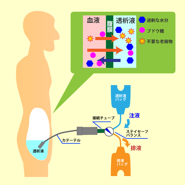 腹膜透析(PD)は、在宅で行う透析療法で、普段の通院は月に1~2回程度です。 自分の体の中の「腹膜」を利用して血液をきれいにします。